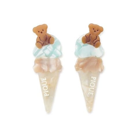 色んなフレーバーのカラフルなアイスクリームが可愛い、春の気分いっぱいの雑貨シリーズです。透明感と光沢感がきれいなアセチの多色使いで、美味しそうなアイスクリームを表現したミニヘアクリップの2個セット。ベアやハート、カラースプレーなどをデコレートしたアイスクリームと、ブランドロゴ入りのコーンがポイントです。色はクリームとピンク、ミントの3色展開。それぞれの色合いに合わせたカラフルな台紙が付いているので、同シリーズの雑貨を組み合わせてギフトにもおすすめです。