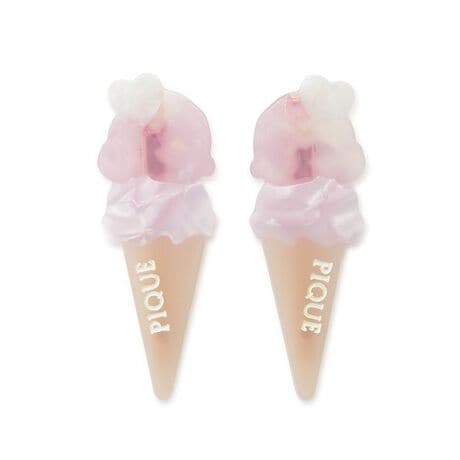 色んなフレーバーのカラフルなアイスクリームが可愛い、春の気分いっぱいの雑貨シリーズです。透明感と光沢感がきれいなアセチの多色使いで、美味しそうなアイスクリームを表現したミニヘアクリップの2個セット。ベアやハート、カラースプレーなどをデコレートしたアイスクリームと、ブランドロゴ入りのコーンがポイントです。色はクリームとピンク、ミントの3色展開。それぞれの色合いに合わせたカラフルな台紙が付いているので、同シリーズの雑貨を組み合わせてギフトにもおすすめです。