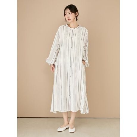 柔らかくナチュラルな風合いに心癒される、ガーゼ素材のシリーズです。ゆったりとした身幅とロング丈で仕上げた、バンドカラーのガーゼワンピース。袖口はゴム入りでまくりやすく、裾にはスリットを入れて動きやすく仕上げました。第一ボタンを外して襟を抜けば、抜け感のあるカジュアルな雰囲気になります。色はソフトなピンクと爽やかなランダムストライプ柄をご用意。同シリーズの雑貨と合わせてお楽しみください。