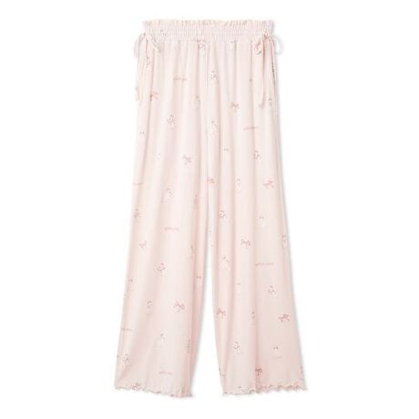 イースターのお祝いを思わせる淡いグリーンや、春らしいピンクのリボンを付けたうさぎがキュートな、ラビット柄のカットソーシリーズです。ウエストに小さなフリルをあしらったフェミニンな印象のロングパンツ。両サイドに付けた手結びのリボンでウエストを絞れるので、短めのトップスと合わせても可愛くはいていただけます。色はオフホワイトとピンクの2色展開。同シリーズのプルオーバーや雑貨とコーディネートしてお楽しみください。