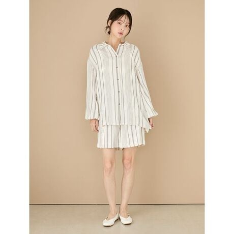 柔らかくナチュラルな風合いに心癒される、ガーゼ素材のシリーズです。ゆったりとした楽なはき心地で毎日着用したくなる、デイリーに使いがしやすい色合いのハーフパンツ。ウエストにステッチを入れ、裾にはステッチをあしらって、カジュアルな印象に仕上げています。腰元には刺繍が入っているのもポイント。両脇にはポケットも付けました。色はソフトなピンクと爽やかなランダムストライプ柄をご用意。同シリーズのシャツや雑貨と合わせてお楽しみください。