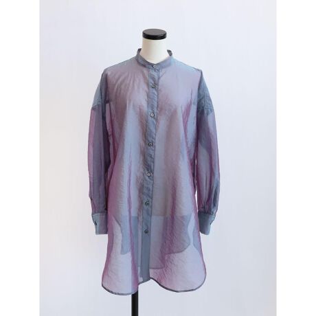 シアーの抜け感とシワの風合いが柔らかな印象のノーカラーシャツ。パープルはまるでオーロラのような幻想的で美しい色味をお楽しみいただけます。ヒップが隠れるロング丈が魅力で、リラクシーな着用感。フロントに配された貝釦は洗練された印象を与えるアクセントに。一枚でシャツとして着こなすのはもちろん、季節の変わり目の軽やかな羽織としても活躍する逸品です。