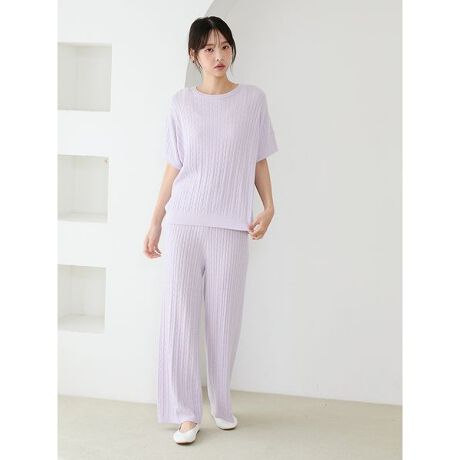 汗ばむ季節にもなめらかな肌触りをお楽しみいただける、’スムーズィーライト’を使用した軽やかなアランニットのシリーズです。ゆとりを感じるストレートシルエットで大人見えするロングパンツ。編み目の縦のラインがさりげなく脚長に見せてくれます。右後ろにポケット付き。初夏を思わせるメリハリのある色使いにもこだわりました。色は涼しげなラベンダーと鮮やかなピンク、落ち着きあるネイビーの3色展開。同シリーズのプルオーバーやカーディガンとのセットアップがおすすめです。
