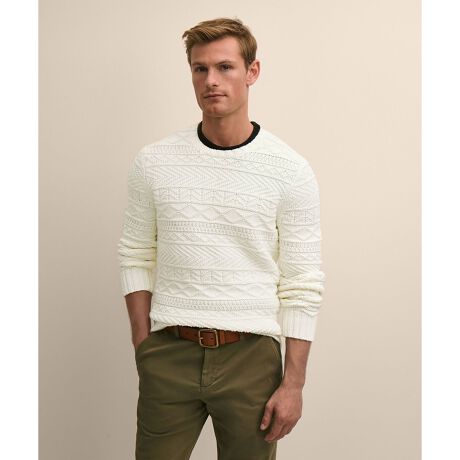 柔らかなホワイトのボディには、伝統的な編み模様が立体的に浮かび上がり、一枚で主役級の存在感を放ちます。