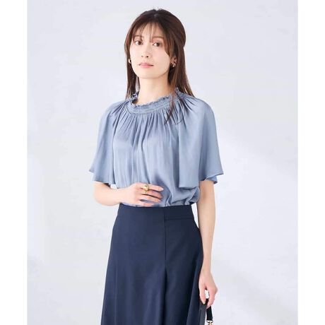 首元に入ったシャーリングが可愛い涼し気なエアリーサテン素材のフレアブラウスです。