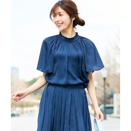 首元に入ったシャーリングが可愛い涼し気なエアリーサテン素材のフレアブラウスです。