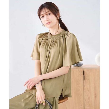 首元に入ったシャーリングが可愛い涼し気なエアリーサテン素材のフレアブラウスです。