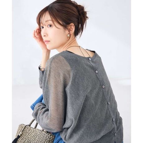 繊細な微光沢感あるシアー素材を使用したクルーネックカーディガン。
