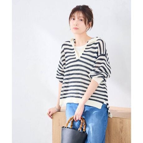 ざっくりとした編地が軽やかな印象のフード付きニット。