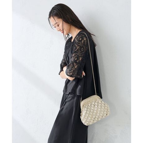 繊細な編みにパールがきらめくミニバッグ。