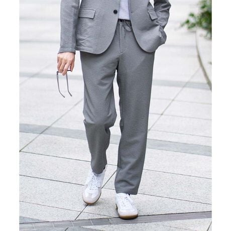 ストレッチの効いた薄手のシアサッカー素材を使用したきれいめリラックスで大人見えするテーパードパンツです。