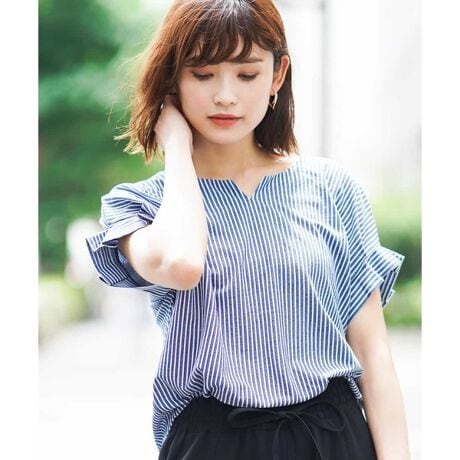 [型番:K2KHD51034]◆涼感あるストライプ柄◆袖に施したタックやすっきりとしたスリットネックがデザインポイントのブラウス見えカットソー。さらりとした生地が夏に着やすく、おしり隠れるチュニック丈なので、安心して着て頂けます。※34(XSサイズ)・42(XLサイズ)はWEB・一部限定店舗での販売です。