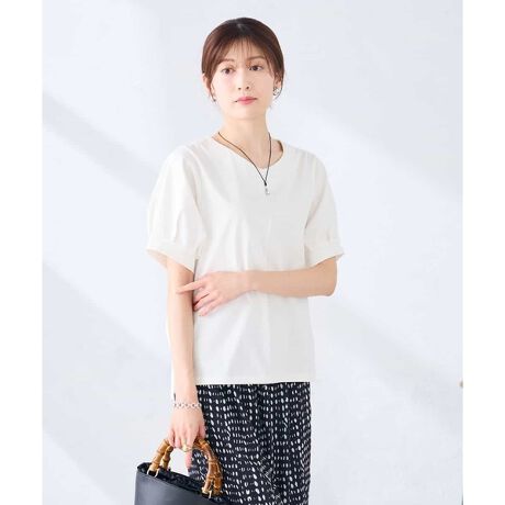 [型番:K2KHD51034]◆涼感あるストライプ柄◆袖に施したタックやすっきりとしたスリットネックがデザインポイントのブラウス見えカットソー。さらりとした生地が夏に着やすく、おしり隠れるチュニック丈なので、安心して着て頂けます。※34(XSサイズ)・42(XLサイズ)はWEB・一部限定店舗での販売です。