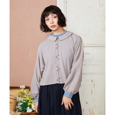 シンプルながらもボタンが目を惹くブラウス。ドルマンスリーブで身幅にゆとりを持たせたリラクシーなシルエットです。フラットカラーの襟付きのデザインやふんわりとした袖が女性らしい雰囲気を後押し。ショート丈のジャケットライクなデザインで、羽織としても活躍します。ジグザグと付けたボタンにも注目◎