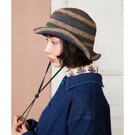 [型番:GG7DE32080]軽やかなペーパー素材の糸をカラフルにボーダー上に織り上げたバケットハット。ニュアンスあるカラーリングとボーダー配色がスタイリングに柔らかいアクセントを加えます。スベリ部分はベルクロテープ仕様でサイズ調節も出来、ソフトワイヤー入りのプリムエッジが程よく形をキープ。取り外し可能なストラップ付きでカジュアルに合わせていただけるトレンド感あるお作りです。涼しげで夏の日除けにぴったりです。