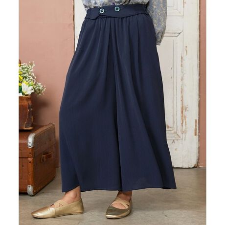 シンプルながらもボタンが目を惹くワイドパンツ。スカートライクな分量感のあるデザインで歩くたびに揺れるドレープが女性らしい印象を演出。ウエストから裾にかけて広がるシルエットは体のラインを自然にカバーしてくれるもの嬉しいポイントです。オールゴムウエストながらもセンターフロントの前ベルトで上品さをプラス◎長すぎない丈感で、どんなトップスとも相性抜群です。