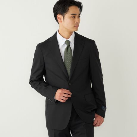 シンプルな無地の生地で、様々なシャツやネクタイを合わせやすい1着です。