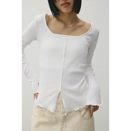 [型番:500JSR80-2491]モデル身長163cm(FREEサイズ着用)前後2WAYで着用できるリブカットトップス。コンパクトなシルエットに後ろ襟ぐりを深めに設定、後ろ中心裾にはスリットを施すことで女性らしさをプラス。さらりとした肌触りと程よいフィット感のあるコットンリブ素材を使用。袖口、裾、背中心はメローで仕立てたシンプルながらディテールにこだわった一枚です。透け感あり、ストレッチあり【お手入れ方法】マシンウォッシュ可