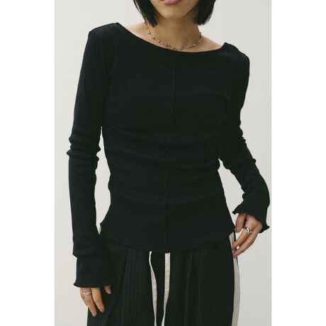 [型番:500JSR80-2491]モデル身長163cm(FREEサイズ着用)前後2WAYで着用できるリブカットトップス。コンパクトなシルエットに後ろ襟ぐりを深めに設定、後ろ中心裾にはスリットを施すことで女性らしさをプラス。さらりとした肌触りと程よいフィット感のあるコットンリブ素材を使用。袖口、裾、背中心はメローで仕立てたシンプルながらディテールにこだわった一枚です。透け感あり、ストレッチあり【お手入れ方法】マシンウォッシュ可