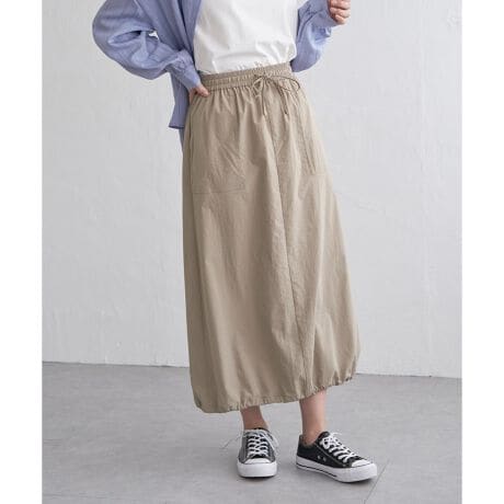 裾にドロストを使用し、Aラインでもバルーンシルエットでも楽しめるカーゴスカート。