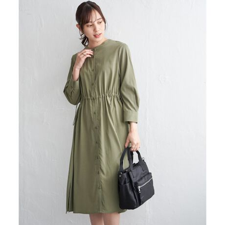 肌触りがよく、ほどよい膨らみのあるきれいめ素材を使用したバンドカラーシャツワンピース。