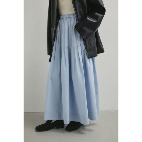 WHT,BLK:モデル身長175cm(Mサイズ着用)SAX:モデル身長160cm(Mサイズ着用)ボリューム感とハリのある素材でふんわり広がるフレアシルエットが魅力のタックプリーツスカート。程よくカジュアルな着こなしが楽しめる素材感でデイリーコーデにこなれ感をプラス。シンプルなトップスと合わせるだけで、ボリューム感を活かしたおしゃれなスタイルが完成します。ウエストは調節可能。透け感なし、ストレッチなし。【お手入れ方法】マシンウォッシュ可