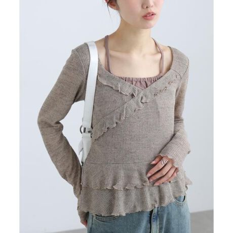 メランジ調でスラブのある、ゆるめのニットソーカシュクールに、ホルターネックのフライスカットソーをドッキングしたトップス。前開きが広いカシュクールですが、インナーのホルターネック付きで安心して着られます。インナーは前身頃のみに付けており、厚みがでないよう工夫しています。さりげない微配色でレイヤードを引き立てつつ、主張しすぎないバランスに。裾はアシンメトリーのフリルデザインにし、片側が上がるシルエットでスタイルアップを期待できます。スウェットパンツやバレルパンツ、デニムパンツと相性良く着回せます。※モデルの着用画像の場合、光の当たり具合により、実際の色味と異なって見えることがございます。色味は、商品単体の画像をご参照ください。