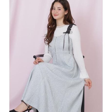 上品なツイード素材を使用したフェミニンなジャンバースカート。異素材の肩フリルとリボンがさりげないアクセントになり、胸下切り替えデザインで、スタイルアップ効果も期待できます。シアーなニットやブラウスとのレイヤードで、ロングシーズン活躍。可愛さと品の良さを兼ね備えた着回し力の高いアイテムです。※撮影時照明の関係により、色味が違って見える場合がございます。またパソコン・スマートフォンなどの環境により、若干製品と画像のカラーが異なる場合もございます。予めご了承ください。商品の色味は、商品単品画像をご参照下さい。※商品画像はサンプルのため、色味やサイズ等の仕様に変更がある場合がございますので、予めご了承ください。