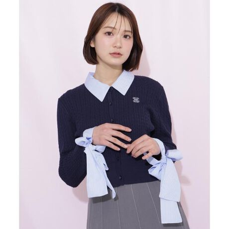 襟と袖のカフスリボンに布帛のシャツ地を使用したキャッチーな印象のニットが登場。ミニケーブル編みが春らしいデザインで、袖口の重ね着したような大きなリボンカフスが目を引く今年らしい一枚。※撮影時照明の関係により、色味が違って見える場合がございます。またパソコン・スマートフォンなどの環境により、若干製品と画像のカラーが異なる場合もございます。予めご了承ください。商品の色味は、商品単品画像をご参照下さい。※商品画像はサンプルのため、色味やサイズ等の仕様に変更がある場合がございますので、予めご了承ください。
