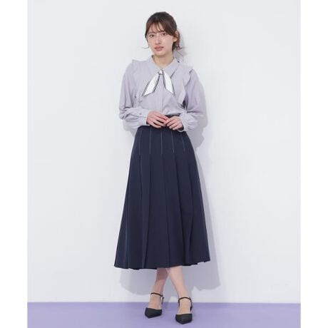 ウエストの両サイドにバックルがついた、片倒しの太目のプリーツがトレンドのミディ丈プリーツカート。ドライタッチで春〜初秋まで長い期間着まわすことのできる万能なスカートで、ブラウス合わせでオフィスに、アーガイルやケーブルニット、ソックス等のアイテムに合わせてカジュアルなコーデに合わせても◎。※撮影時照明の関係により、色味が違って見える場合がございます。またパソコン・スマートフォンなどの環境により、若干製品と画像のカラーが異なる場合もございます。予めご了承ください。商品の色味は、商品単品画像をご参照下さい。※商品画像はサンプルのため、色味やサイズ等の仕様に変更がある場合がございますので、予めご了承ください。