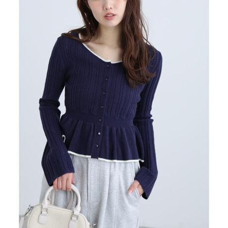 コンパクトなサイズ感の地柄ペプラムニット。縦柄と小さめアイレットで肌が見えにくく、すっきりとした印象です。裾は肉厚フリル仕様、ウエストはリブを寄せることでペプラムシルエットを演出。ウエスト上はコンパクト、下はフリルでメリハリのあるバランスです。衿元はスカラップ配色、裾端の配色もポイント。袖は肘まわりを細くし、袖口にかけてフレアに広がるデザインです。ウエストまわりがすっきりしたボトムスとのコーディネートがおすすめ。コンパクト丈でアウターを選ばず着用できます。※モデルの着用画像の場合、光の当たり具合により、実際の色味と異なって見えることがございます。色味は、商品単体の画像をご参照ください。