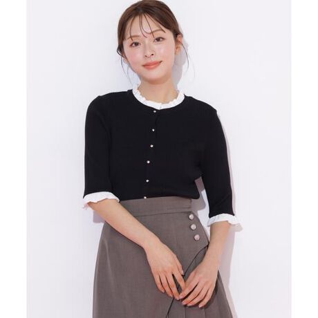 フリルシャツを重ね着したようなコンパクトリブニット。衿と袖口から出た控えめなフリルとツヤ感のある上品な金ボタンがポイントです。フロント釦の隙間から中が見えないように前立ては見せかけの仕様で、1枚で着用いただけます。※撮影時照明の関係により、色味が違って見える場合がございます。またパソコン・スマートフォンなどの環境により、若干製品と画像のカラーが異なる場合もございます。予めご了承ください。商品の色味は、商品単品画像をご参照下さい。※商品画像はサンプルのため、色味やサイズ等の仕様に変更がある場合がございますので、予めご了承ください。