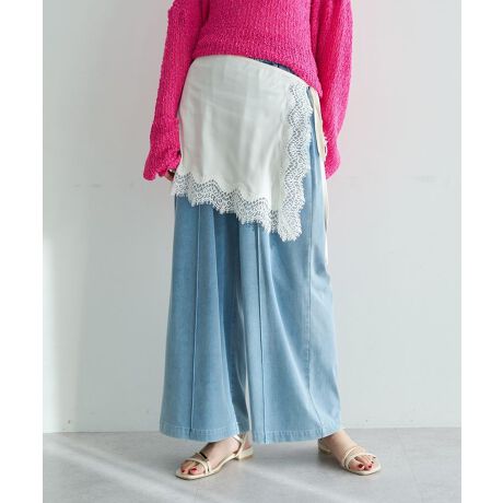 デニム風素材のワイドパンツとサテンレースのラップスカートの2点セット。