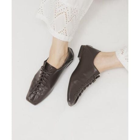 踵を踏める仕様にした、レースアップデザインが特徴的なシューズ。かっちりとした印象ながらも、柔らかな生地を使用しているのでデイリーに使いやすいです。トゥ先や、アッパーの深さなど細部までこだわりました。