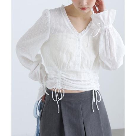 小さなドット柄と繊細なストライプがかわいい、表情ゆたかなカットドビーブラウス。軽やかなシアー素材で女性らしい柔らかな印象に見せてくれます。襟のさりげないフリルと程よいボリュームスリーブが華やかさをプラス。ウエストはドロスト仕様でシルエットの変化も楽しめます。コンパクトな丈感でバランスが取りやすく、ハイウエストボトムやワイドパンツとも好相性。デイリーからお出かけまで幅広く活躍します。※モデルの着用画像の場合、光の当たり具合により、実際の色味と異なって見えることがございます。色味は、商品単体の画像をご参照ください。