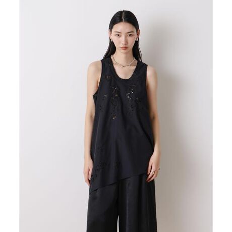 今季も「STEVELOUR」シリーズが登場!オリジナルのフラワー刺繍をあしらったアシメタンクトップ。襟元には「STEVELOUR」の文字刺繍入りで、さりげなくブランドらしさを演出。柔らかく滑らかな素材にポリエステルを混紡することで、洗濯後もシワになりにくく、扱いやすさも兼ね備えたフェミニン&モードな一枚です。