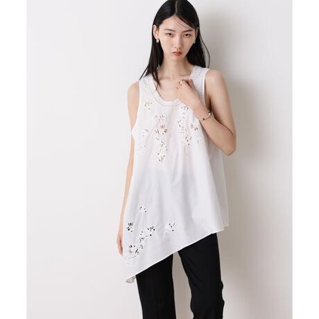 今季も「STEVELOUR」シリーズが登場!オリジナルのフラワー刺繍をあしらったアシメタンクトップ。襟元には「STEVELOUR」の文字刺繍入りで、さりげなくブランドらしさを演出。柔らかく滑らかな素材にポリエステルを混紡することで、洗濯後もシワになりにくく、扱いやすさも兼ね備えたフェミニン&モードな一枚です。