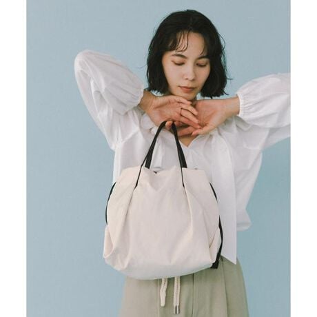 ドローストリング仕様で、絞り具合によってバッグのシルエットを自由に変えられます。細めのハンドルが繊細な印象をプラスし、カジュアルすぎない絶妙なバランスを保っています。