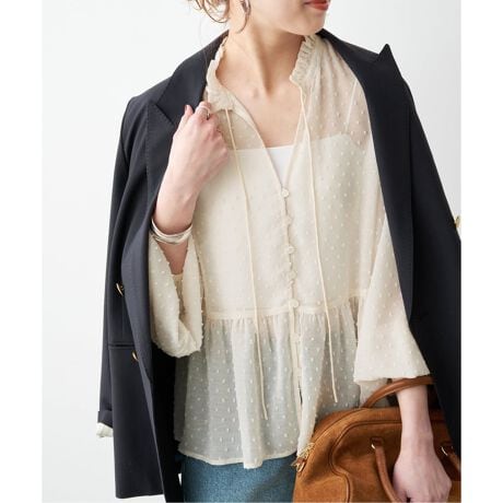 1枚で着映える、ドビードットフリルリボンブラウス。