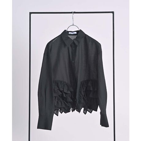 フロントはベーシックなシャツディテールにすることで、フリルの存在感を引き立てつつ、着こなしやすさも確保。