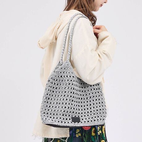 手編みのメタリック糸で丁寧に編み上げた、きらめきが美しいマクラメショルダーバッグ。