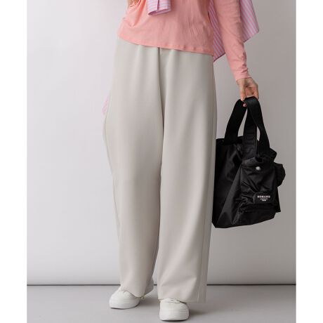 イージーな穿き心地と、大人の女性にふさわしい「程よいきれいさ」を兼ね備えたワイドパンツです。マットな質感の生地をベースに、光沢感のあるサテン素材を部分的に切り替えることで、さりげないアクセントと上品なコントラストを効かせました。ウエストはドローストリング仕様で調整がしやすく、ストレスフリーな着用感を実現しています。適度なハリのある素材が脚のラインを拾いすぎず、すっきりとした美しいシルエットを演出します。ブラウスやジャケットを合わせればオフィスシーンに、カットソーやニットを合わせれば休日のカジュアルスタイルにと、オンオフ問わず幅広いシーンで活躍する万能アイテムです。カラーは、シックで着回し力の高いブラック(#005)と、優しく上品なニュアンスのベージュ(#033)の2色展開です。
