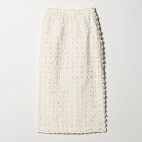 大きめなスクエアのカットジャガードで表現したフリンジが印象的なスカート。