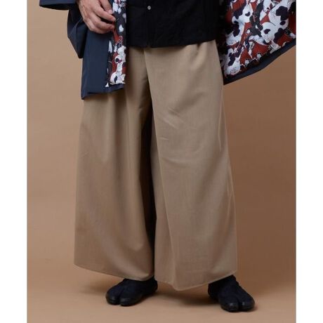 [型番:76T-6103-2026]無地でコーディネートに合わせやすいメンズパンツ。大きなタックを入れることで袴のようなシルエットに仕立てました。ウエスト紐付きで調整がしやすく、すっきりとした腰まわりが特徴です。さらりとした肌触りのポリエステルレーヨン生地で足さばきも軽く、サイドとバックにポケットが付いています。