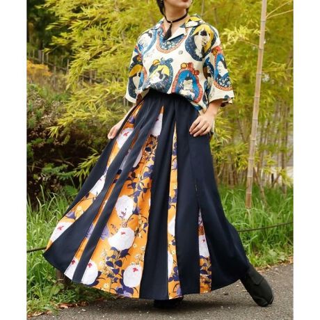 [型番:7CC-6101-2026]花柄をあしらった八掛(はっかけ)のスカート。袴をイメージした形で、動くたびに揺れるシルエットが美しい仕立てです。シワになりにくいポリエステル素材を使用し、一華、芍薬、牡丹の花が上品に彩ります。日常にも特別な日にも映える華やかなスカートです。