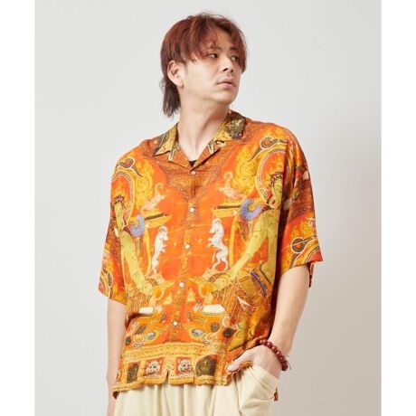 [型番:IAC-6134-2026]チベット仏教の仏画の掛軸「タンカ」を大胆にプリントしたメンズシャツ。肌触りの良いコットン生地は通気性も抜群。チベットの精神性とアートを纏う唯一無二の一枚。