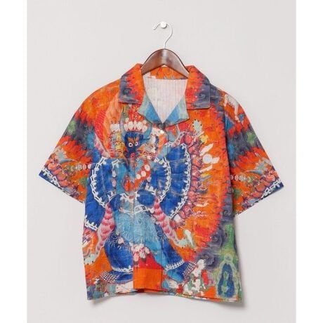 [型番:IAC-6133-2026]チベットの宗教画「タンカ」を大胆にプリントした総柄シャツ。肌なじみの良いコットン素材で着心地快適。着るだけでアートを感じられるデザイン。