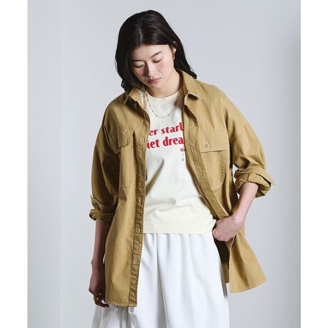 ・ベージュツイルシャツはウォッシュと軽いブラスト加工で、色ムラやニュアンスをプラス