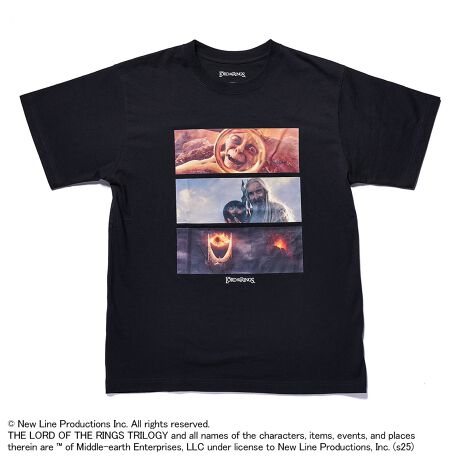 世界的ベストセラーである「指輪物語」を映画化した傑作ファンタジー『ロード・オブ・ザ・リング』。ゴラム、サルマン、サウロンの目がデザインされたTシャツです。