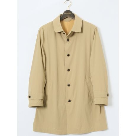 オンオフ兼用で着回せる、シンプルなステンカラーコートです。木目調の大き目なボタン、手の入れやすいポケット、スリーブストラップが付いた袖、ボタン付きのセンターベントがポイント。軽快さを重視したライトな仕立てなので、タウンユースからビジネスシーンはもちろん、旅行や出張にも大活躍してくれます。